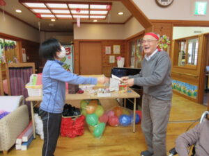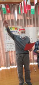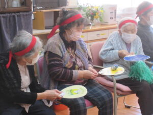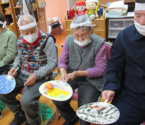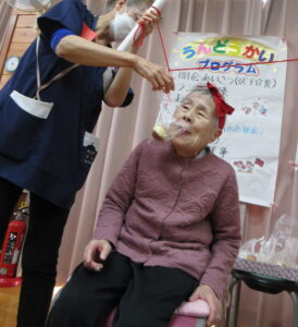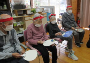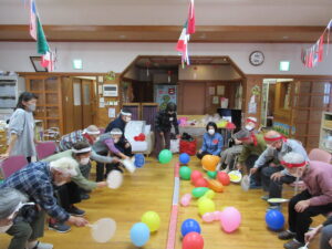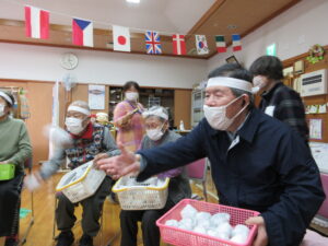 その後はお手玉送り!お手玉をうちわに乗せお隣さんへ落とさず送っていきます。